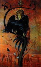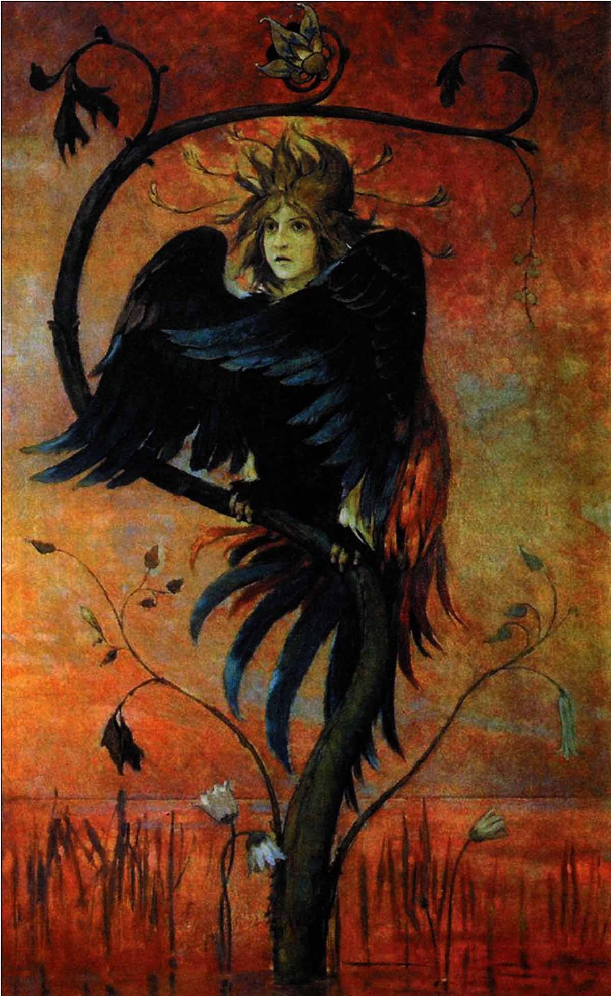 На полотне — утро, ещё туманный, почти невесомый пейзаж. На ветвях причудливого сказочного растения сидит птица с женским лицом. Её тёмное, почти чёрное оперение контрастирует с нежным светом наступающего дня, а в глазах — бездна знания.