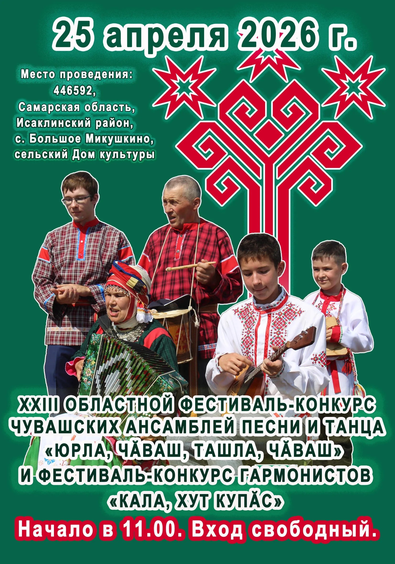 25 апреля 2026 года село Большое Микушкино Исаклинского района Самарской области станет центром чувашской музыкальной и танцевальной культуры. Здесь, в сельском Доме культуры (ул. Советская, 102), состоится XXIII областной фестиваль-конкурс чувашских самодеятельных ансамблей песни и танца «Юрла, чăваш, ташла, чăваш» («Пой, чуваш, танцуй, чуваш») и фестиваль-конкурс гармонистов «Кала, хут купёс» («Играй, гармонь»). Начало – в 11:00.