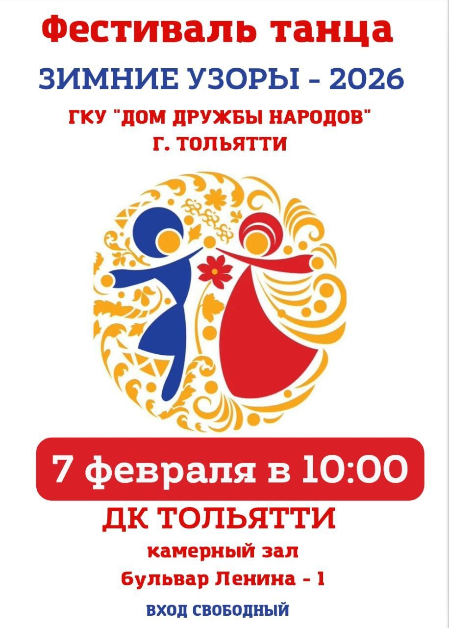 В Доме дружбы народов (отдел в г. Тольятти: б-р Ленина, д.1, ДК «Тольятти» им. Н.В. Абрамова) пройдет детский ежегодный Фестиваль танцев «Зимние узоры – 2026». Традиционно в фестивале примут участие юные танцоры в возрасте от 4 до 16 лет.