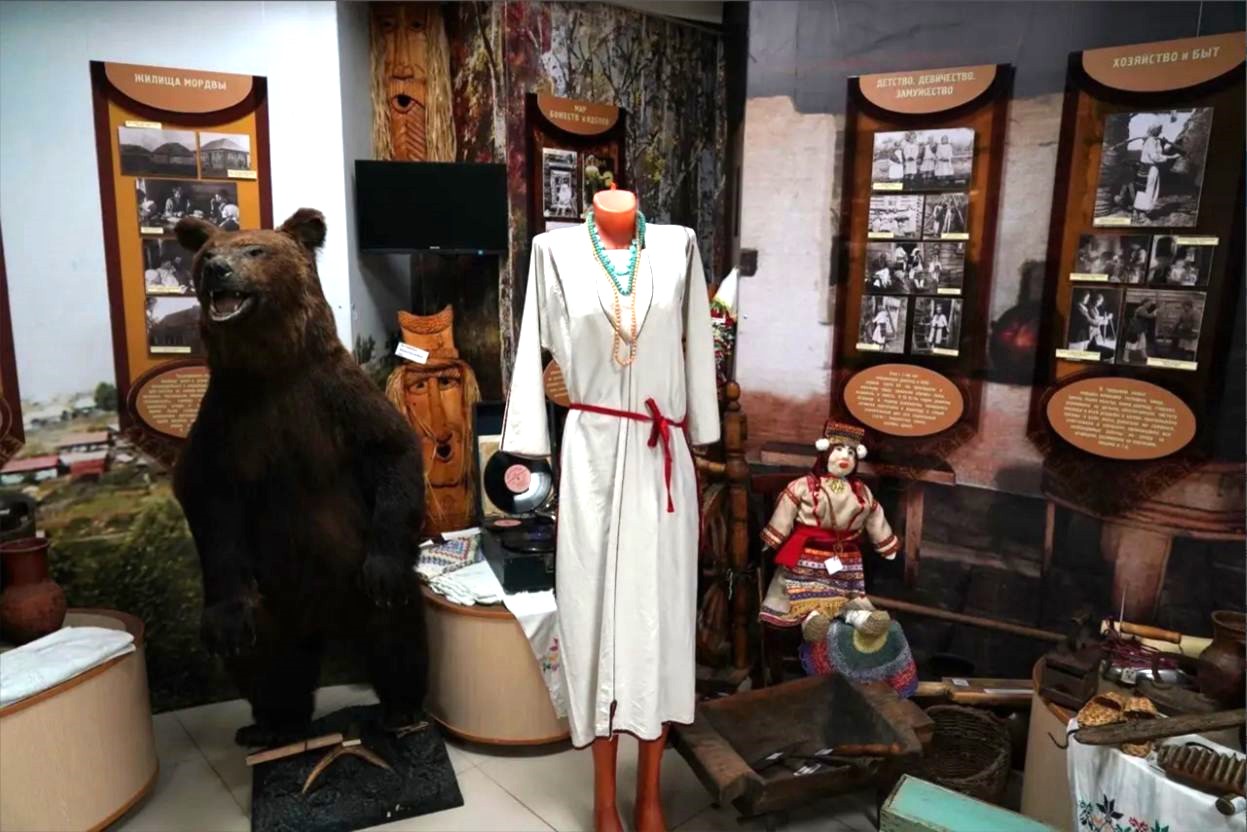 Музейное пространство разделено на несколько тематических зон, каждая из которых раскрывает культуру мордовского народа. В одной из них рассказывается о мире мордовских божеств. Природные стихии, жилища, пасеки, колодцы – все это, по представлениям мордвы, имело своих духов-покровителей. Божества могли быть как добрыми, так и злыми. И о тех, и о других мордва складывала песни, сказки, легенды. Одна из таких рассказывает о женщине, вышедшей замуж за медведя. Этот зверь был почитаем в народе и олицетворял древнего предка. Медведь в мордовском эпосе – тотем, дух-охранитель и хозяин нижнего мира. О культе этого животного напоминает его чучело, ставшее одним из экспонатов.