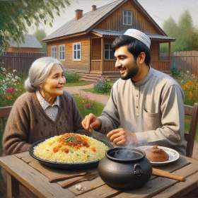Самара, частный сектор на окраине. В небольшом доме на улице Мира пахнет зирой, барбарисом и топлёным маслом. За большим деревянным столом — трое: хозяйка Мария Петровна, её сосед Равшан из Узбекистана и плов, который они только что приготовили вместе.